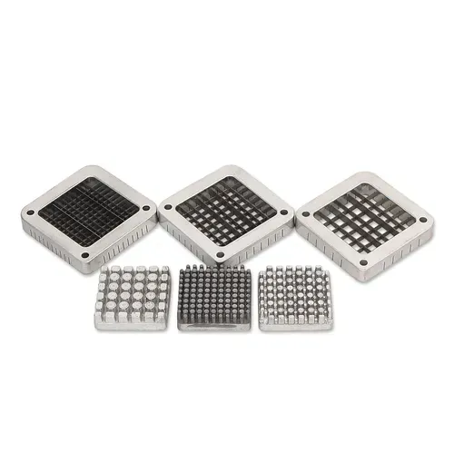The Browne 37514 French Fry Cutter Parts include a comprehensive blade kit designed for efficient and consistent cutting. This kit features a 1/4" cut blade, a sturdy frame, and a pusher block, ensuring optimal performance for creating perfectly shaped fries. Ideal for both commercial kitchens and home use, this durable set enhances your food preparation process, allowing you to serve fresh, uniform fries with ease.